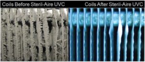 Para el control microbiano mas efectivo los emisores germicidas UV Steril-Aire se instalan en el lado de suministro de aire del sistema enfrente del serpentín de enfriamiento y encima de la bandeja de drenaje. Esta ubicación proporciona un biofilm y un control microbiano mas efectivos que las instalaciones de UVC en los ductos de distribución de aire. El aire recirculado en los sistemas HVAC crea redundancia al exponer los microorganismos a los rayos UVC, asegurando múltiples pases para que la energía de la luz sea efectiva contra grandes cantidades de microorganismos en el aire.